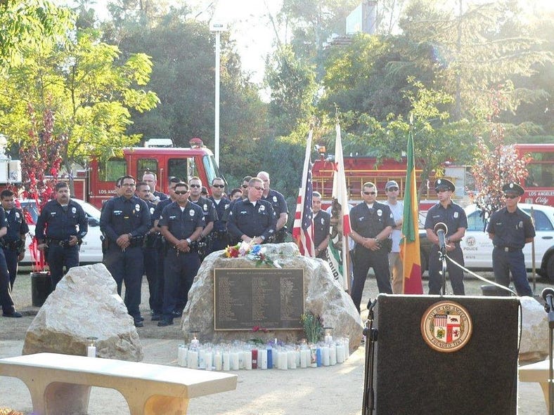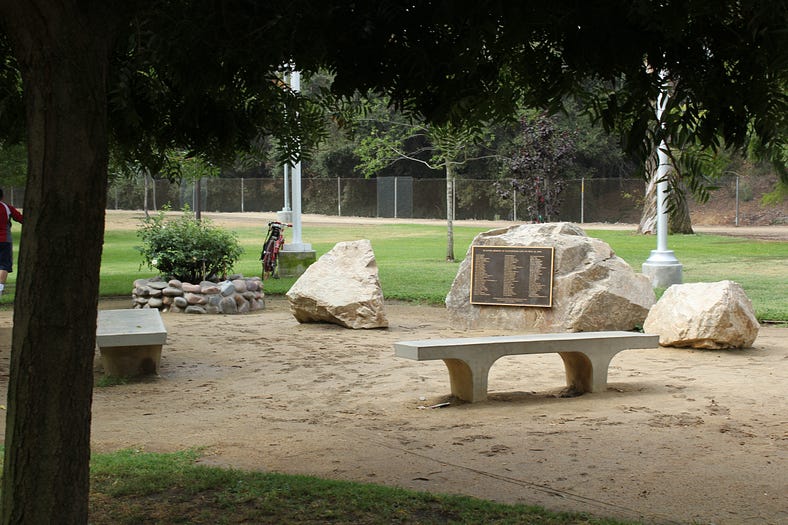 LABT traveled all over the state to churches, homes and schools to plant a tree for each individual family, at a location that had meaning for them. As LABT was talking with one widow she said “they all died together, why not plant all the trees together”. LABT discussed that with the other families and they wanted to do it. Thanks to North Hollywood Park, LABT was able to plant the communal trees there. On June 22, 2002, the families planted their trees and LABT built a memorial where the trees were planted.